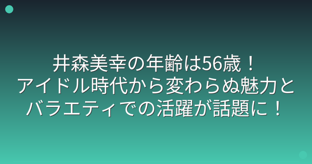 最近、井森美幸さんのクイズ番組での活躍が話題になっていますね。 特に、変わらぬ魅力とバラエティ番組での存在感が注目を集めています。 そこで今回は、井森美幸さんの年齢や活動内容について、詳しく見ていきましょう! 井森美幸の現在の年齢と経歴 井... -