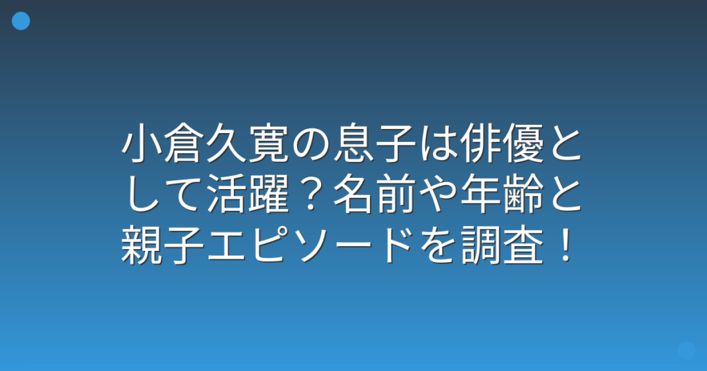 俳優として数々のドラマや映画で活躍されている小倉久寛さんですが、息子さんについて気になっている方も多いのではないでしょうか。 小倉久寛さんの息子さんがどんな方なのか、ファンの間で話題になっていますね。 そこで今回は、小倉久寛さんの息子さん...